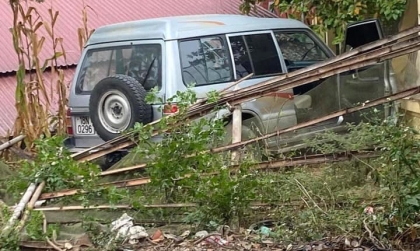 Nghi nhầm chân ga, tài xế cầm lái chiếc Mitsubishi Pajero biển kiểm soát 18N 0296 đã lao lên vỉa hè, đâm móp méo hai xe khác.