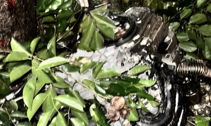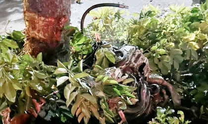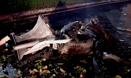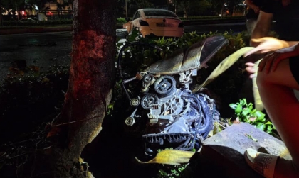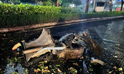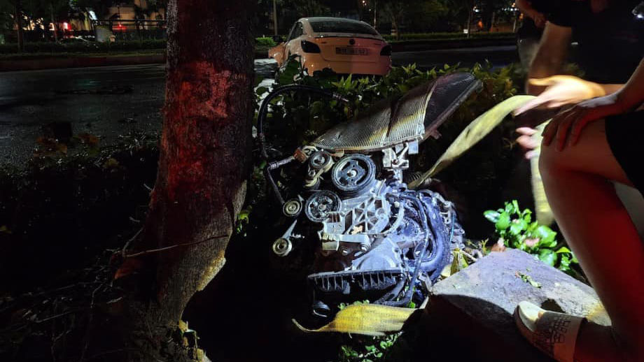 Cú tông mạnh khiến xe bị biến dạng, lốc máy văng vào bồn cây còn trục bánh xe vỡ nát nằm cách đó gần chục mét.