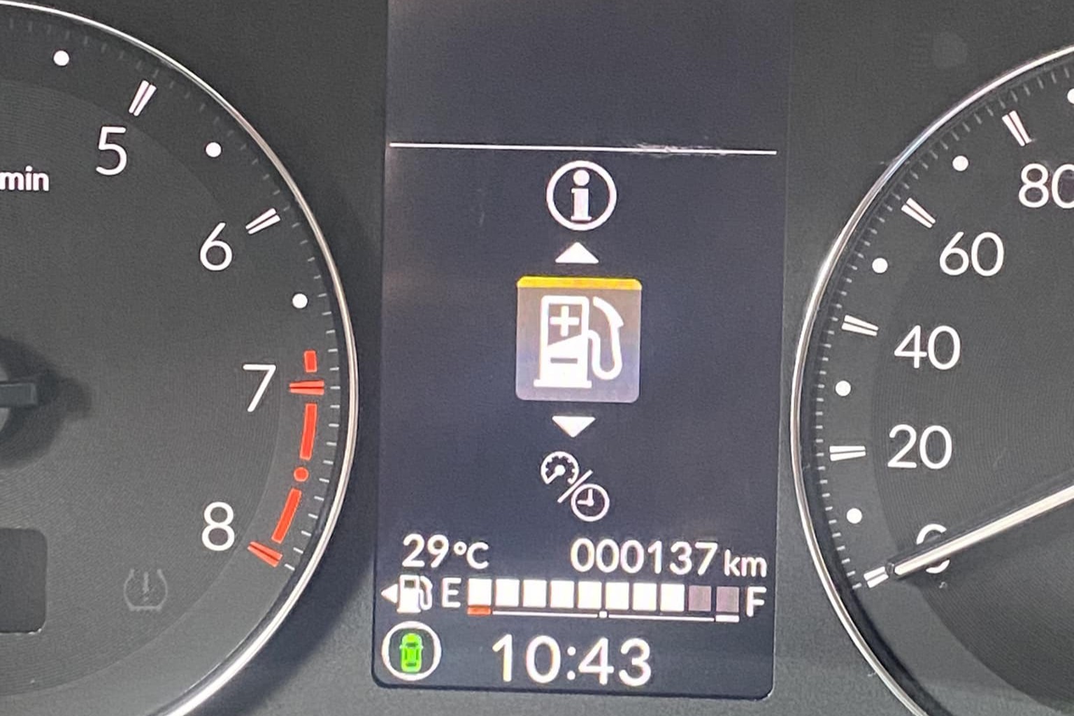 Nó cảnh báo nhiệt độ ngoài trời là 29 độ, bạn đã đi được 137km và hiện tại là 10h 43 phút và xăng của bạn đang gần full