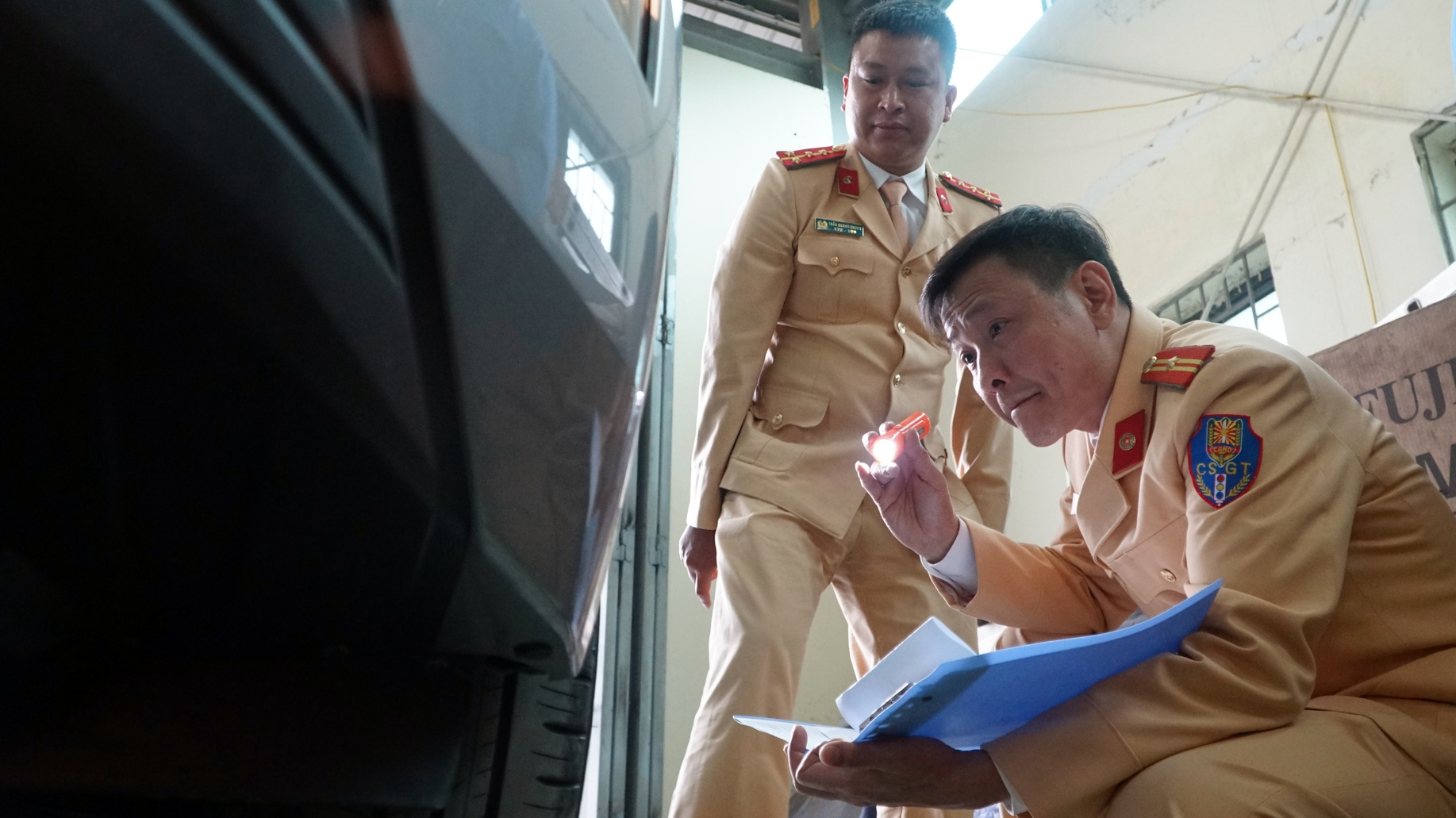 Hình ảnh ngày đầu tiên lực lượng CSGT phối hợp cùng các đăng kiểm viên các trung tâm đăng kiểm thuộc Cục Đăng kiểm Việt Nam.