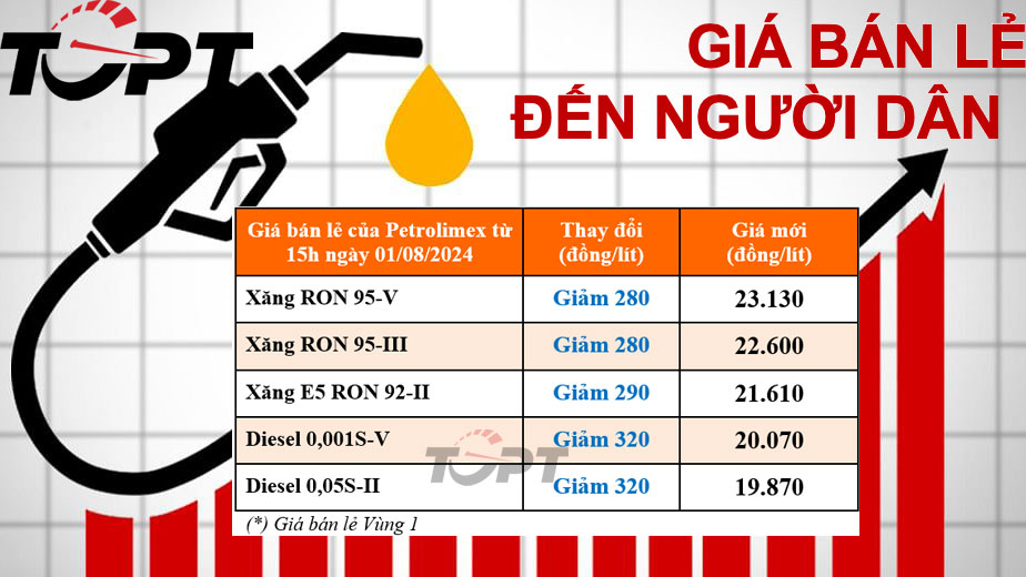 Vào 15h ngày 1/8, Bộ Công Thương đã công bố đợt điều chỉnh giá dành cho các loại xăng dầu theo đúng quy định, giá cơ sở của các mặt hàng hiện như sau: Xăng RON 95-III không cao hơn 22.603 đồng/lít (giảm 281 đồng/lít); xăng E5 RON 92 không cao hơn 21.616 đồng/lít (giảm 284 đồng/lít); dầu diesel 0,05S không cao hơn 19.878 đồng/lít (giảm 316 đồng/lít), dầu hoả không cao hơn 20.095 đồng/lít (giảm 231 đồng/lít), và dầu mazut không cao hơn 16.886 đồng/kg (giảm 292 đồng/kg).
