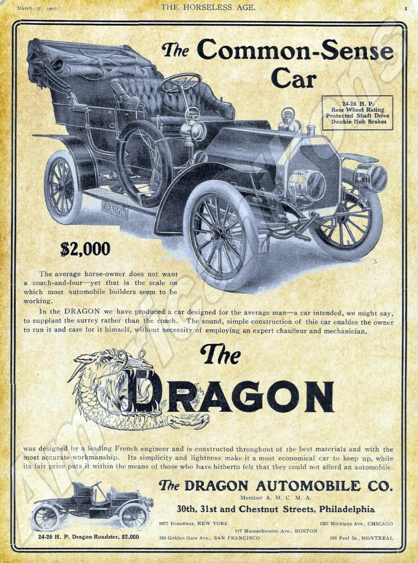 Ít người biết rằng, cái tên Dragon cũng từng được sử dụng cho một thương hiệu ô tô của phương Tây, đó là công ty Dragon Automotive với logo hình con rồng phương Đông, nhưng hãng xe có trụ sở tại Mỹ này chỉ tồn tại được 2 năm với chỉ 3 mẫu xe, kéo dài từ năm 1906 đến năm 1908.
